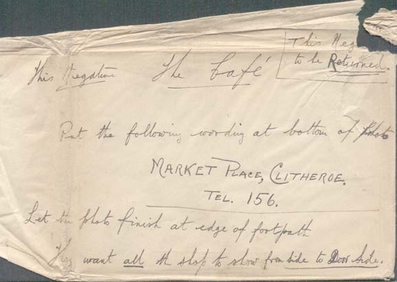 This cafe use to be in the Market Place."Accommadation for Pleasure Parties (what ever they are),Weddings,Whist Drives and Funerals",so its all go at The Cafe.Below is the orginal order for this photograph to be taken.Because of the three digit telephone number and the style in the photograph I guess this photograph was taken around the mid 1920's.
