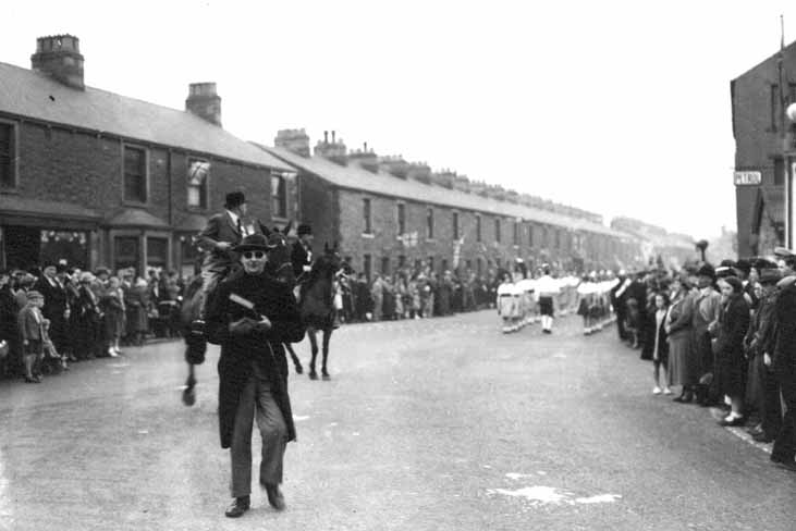 A mad looking preacher leads part of the Torch Light at the bottom of Chatburn Road End.