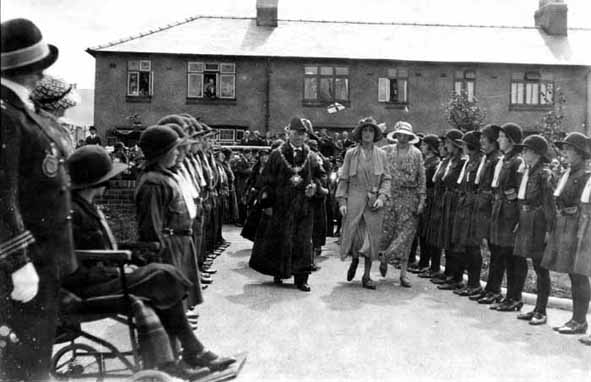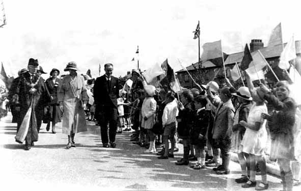 A couple of photographs from 1932 showing the Princess Royal and the local Mayor of the time being greeted by some of the local children.