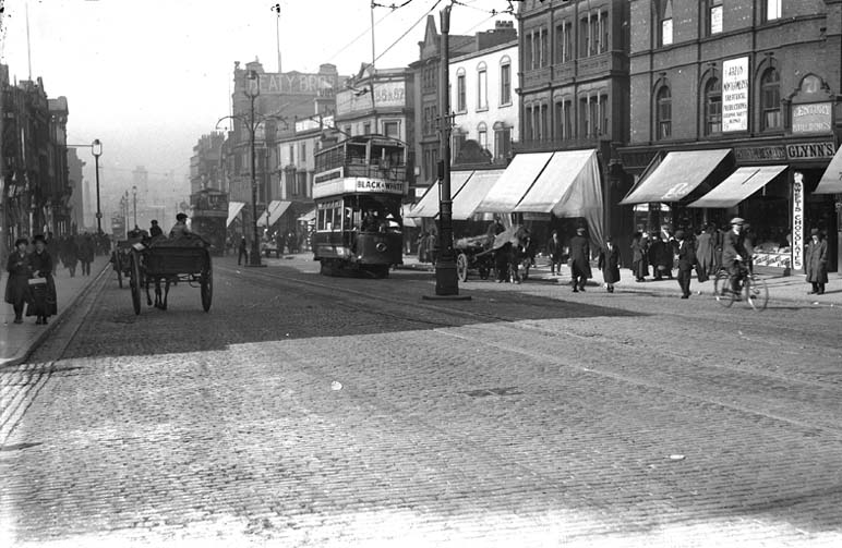 John Tiernan from the Liverpool History Society had this to say about this particular shot: '.....The shops on the far right of the picture are listed in the 1919 Gore's/Kelly's as no.71 'Glynn, Walter Thomas, confectioner', and No.73 'Stewart's Clothiers'. They are on a block between Wilde Street and Norton Street (Stewart's being on the corner with Norton Street.'