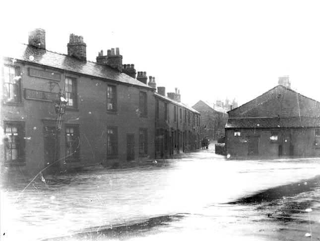 Another photograph of The Bridge Inn.This time the pub is flooded out.Note still next door are some old houses that are now demolished.